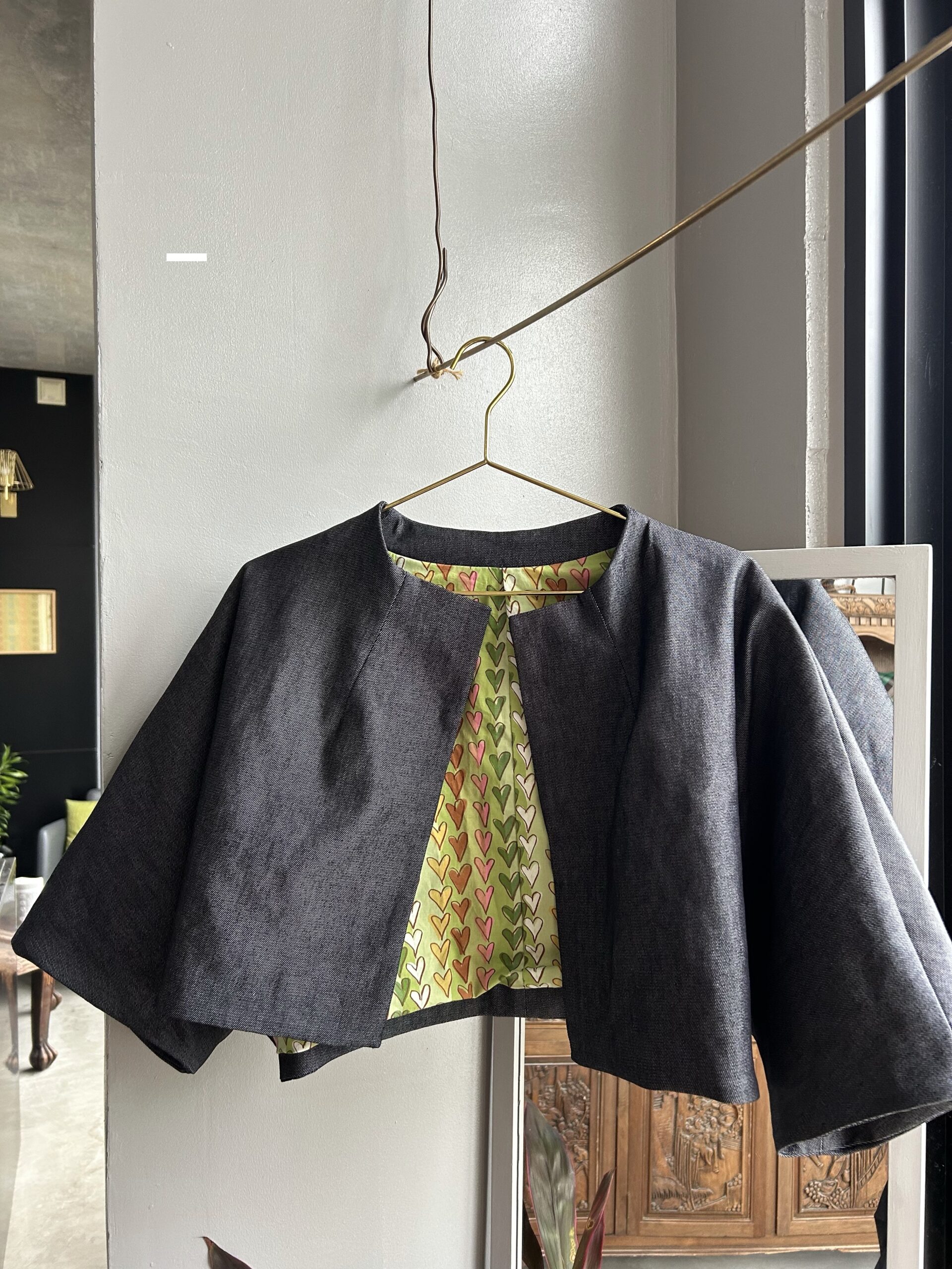 光沢のあるデニム地に遊び心のあるハート柄のコットンを裏地に合わせ、ショート丈のボレロジャケットを製作されました。